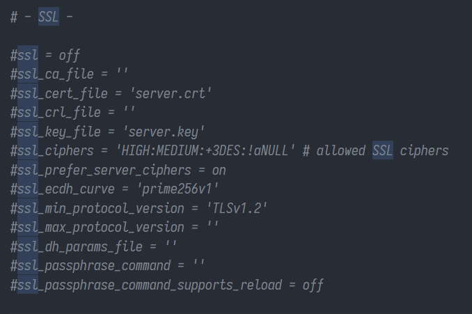 PostgreSQL预编译了OpenSSL模块,可用于通信SSL/TLS连接。若要开启SSL,需要在conf文件中配置