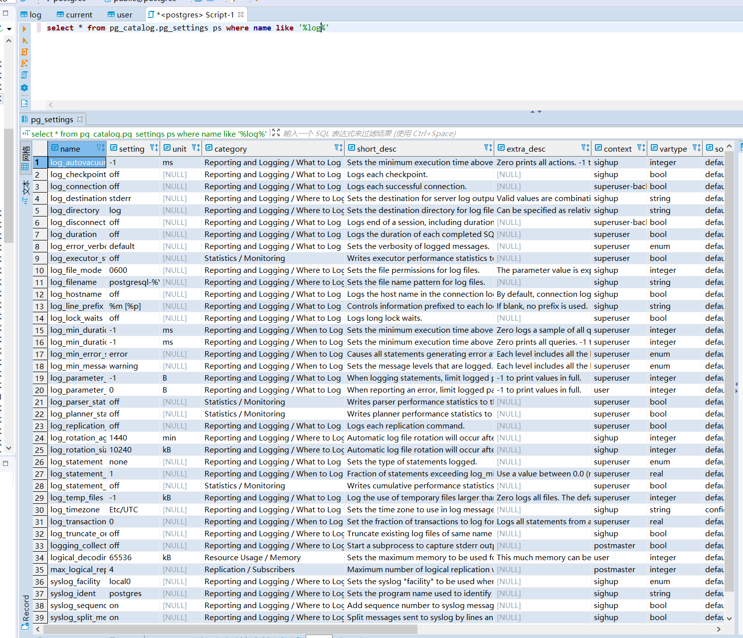 log_line_prefix(日志字段);推荐配置为’%m %p %u %d %r %h’(用户、时间、数据库、IP地址); -
