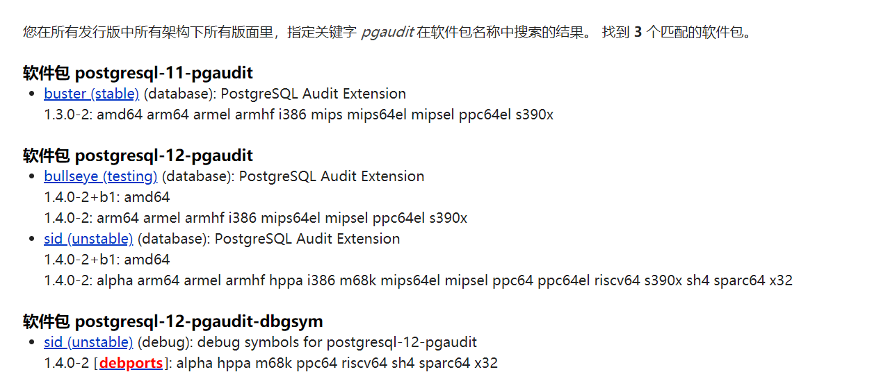 PostgreSQL默认不包含pg_audit插件,需自行下载 pgaudit/pgaudit ,加入contrib后重新编译。此外,Debian/Ubuntu/CentOS的官方repo中包含少量预编译的pgaudit软件包,如果数据库版本匹配的话可直接下载安装。