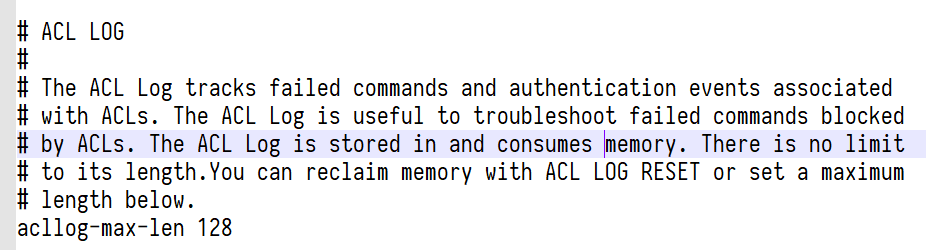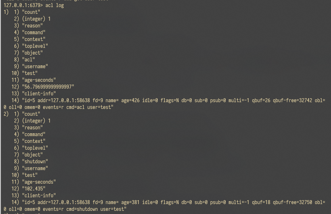 的越权操作仅记录”ACL”。ACL LOG以链表形式存放在内存中,不写文件,无法做到日志持久化。