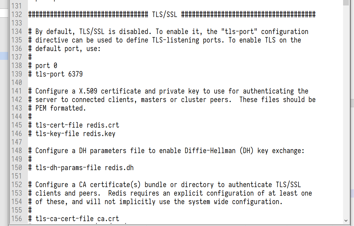 Redis支持TLS/SSL通信加密,也支持X509双向认证。只需要查看conf文件中关于TLS/SSL的相关参数即可(注意观察端口参数是