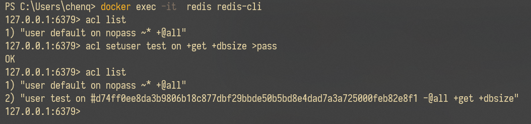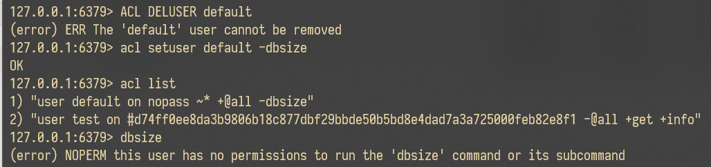 如前文所述,为了保持向下兼容性,Redis存在默认帐户default。该帐户不得删除,可通过