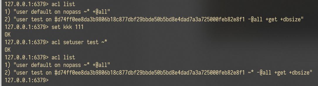 。可以为每个用户独立限制其允许使用的命令,限制允许访问的key(业务数据)。在数据库中输入
